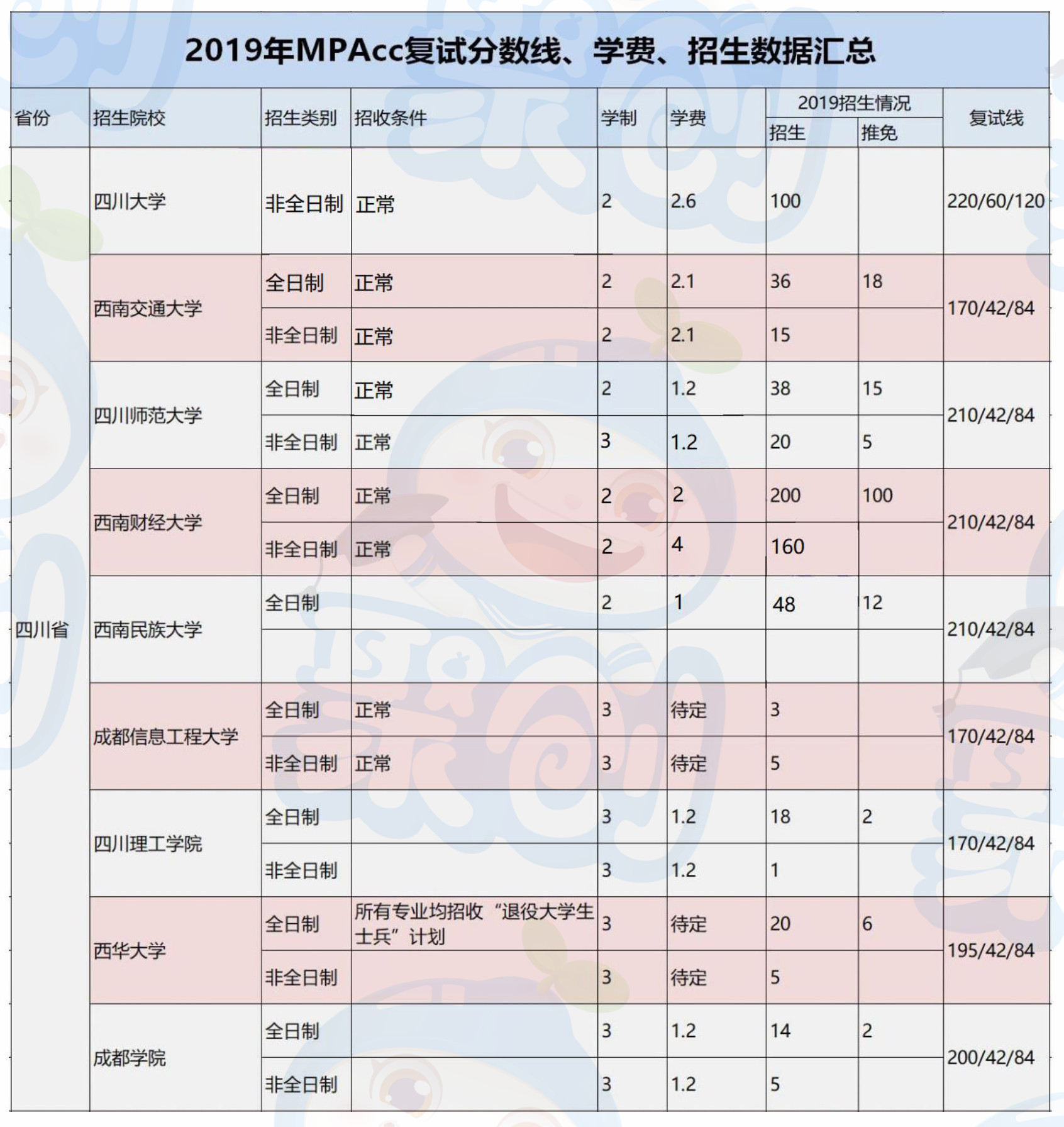 以上是聚创考研网为考生整理的"【四川省】2019年高校会计硕士考研分数线、学费、招生情况分析"的相关考研信息,希望对大家考研备考有所帮助! 备考过程中如有疑问,也可以添加老师微信juchuang911进行咨询。