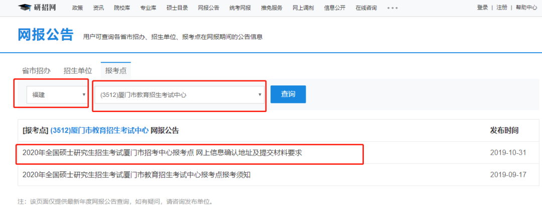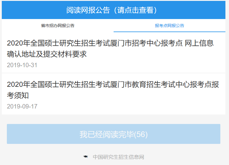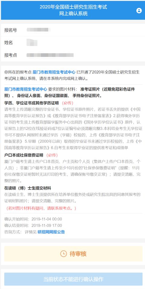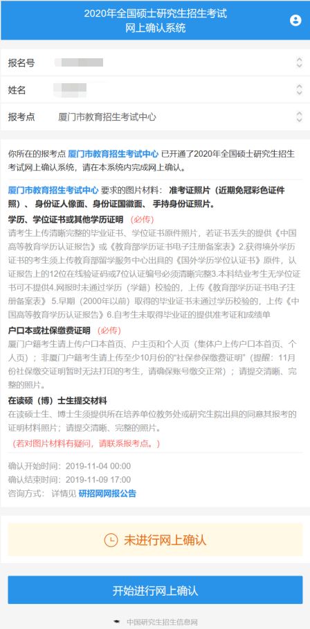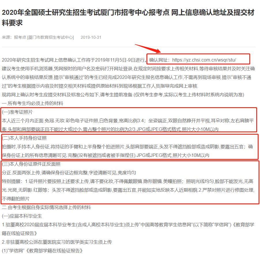 可以看到《2020年全国硕士研究生招生考试厦门市招考中心报考点网上信息确认地址及提交材料要求》这条关于现场确认的通知。