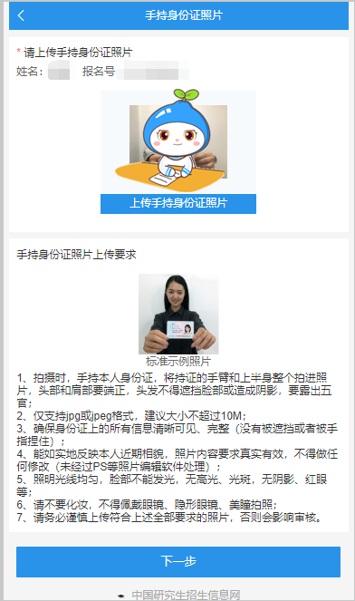 ②本人手持身份证照:拍摄时,手持本人身份证,将持证的手臂和上半身整个拍进照片,头部肩部要端正,头发不得遮挡脸部或造成阴影,要露出五官;确保身份证上的所有信息清晰可见.完整(没有被遮挡或者被手指捏住).JPG或JPEG格式,照片大小10M以内