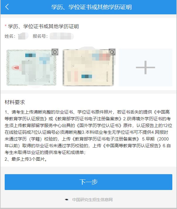 现役军人考生报考研究生考试。须上传(1)有效军人身份证件原件照片(如“军官证”或“士兵证”);(2)毕业证书原件照片(证书丢失的提供“学信网”的《教育部学历证书电子注册备案表》或《中国高等教育学历认证报告》)。