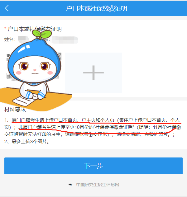 注意:厦门户籍的往届毕业生须提供户口本首页、户主页及个人单页(集体户口提供首页及个人单页) ;非厦门户籍的往届毕业生须提供厦门人社局网站打印的用人单位为其在厦缴纳的社保证明(缴费时段至少涵盖报名及确认期间)