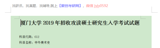 以上是聚创厦大考研网为考生整理的"2019年厦门大学612中外美术史考研真题(回忆版)"的相关考研信息,希望对大家考研备考有所帮助! 备考过程中如有疑问,也可以添加老师微信juchuang911进行咨询。