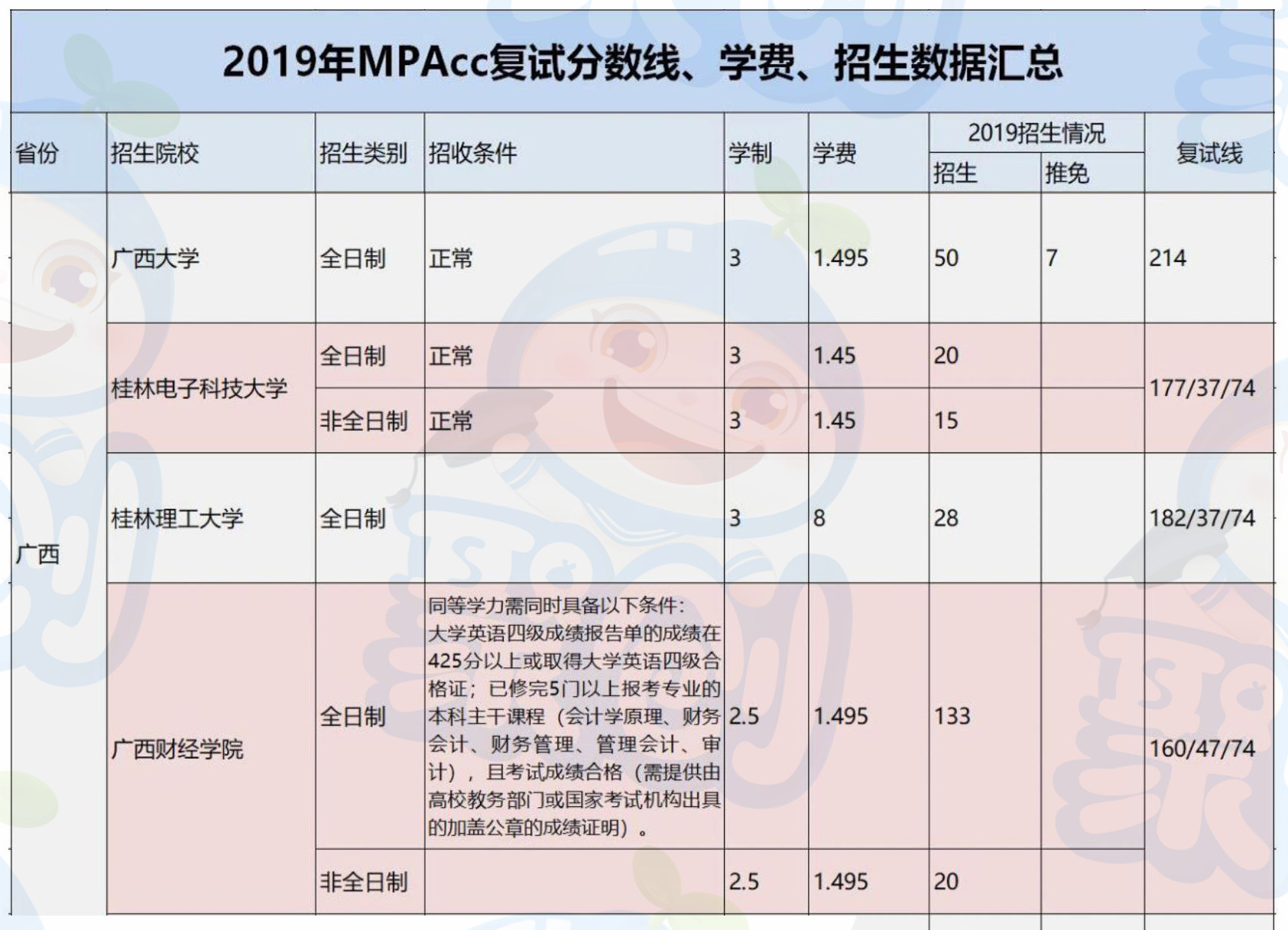 以上是聚创考研网为考生整理的"【广西】2019年高校会计硕士考研分数线、学费、招生情况分析"的相关考研信息,希望对大家考研备考有所帮助! 备考过程中如有疑问,也可以添加老师微信juchuang911进行咨询。