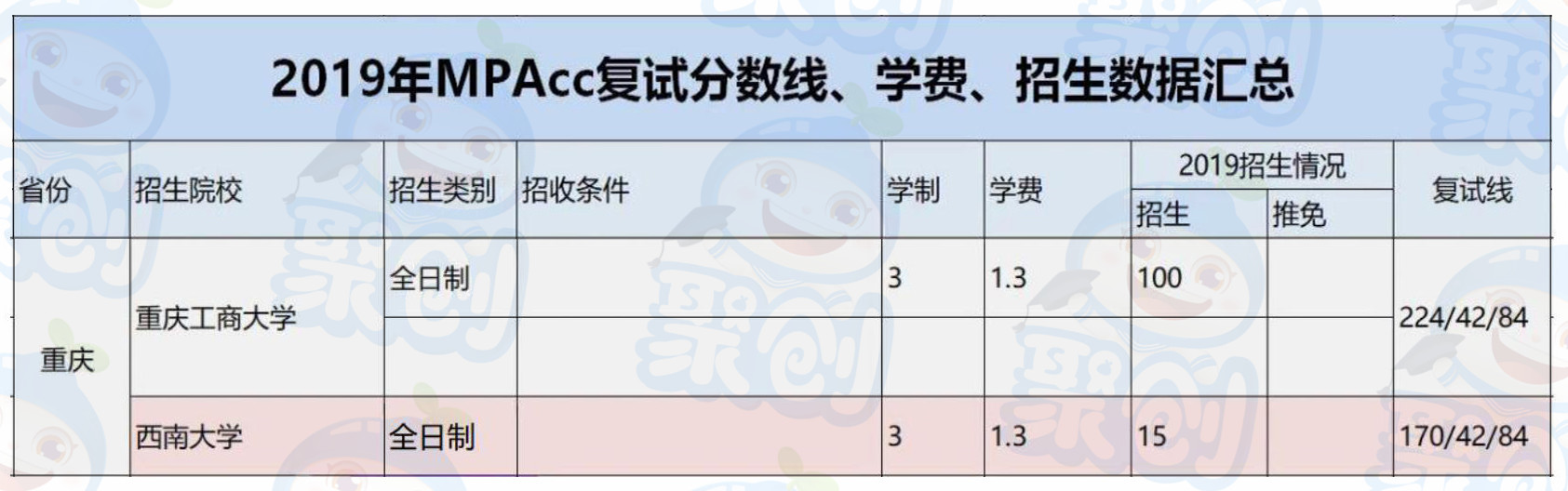 以上是聚创考研网为考生整理的"【重庆市】2019年高校会计硕士考研分数线、学费、招生情况分析"的相关考研信息,希望对大家考研备考有所帮助! 备考过程中如有疑问,也可以添加老师微信juchuang911进行咨询。