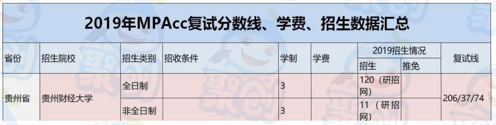 以上是聚创考研网为考生整理的"【贵州省】2019年高校会计硕士考研分数线、学费、招生情况分析"的相关考研信息,希望对大家考研备考有所帮助! 备考过程中如有疑问,也可以添加老师微信juchuang911进行咨询。