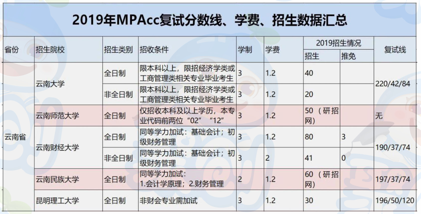 以上是聚创考研网为考生整理的"【云南省】2019年高校会计硕士考研分数线、学费、招生情况分析"的相关考研信息,希望对大家考研备考有所帮助! 备考过程中如有疑问,也可以添加老师微信juchuang911进行咨询。