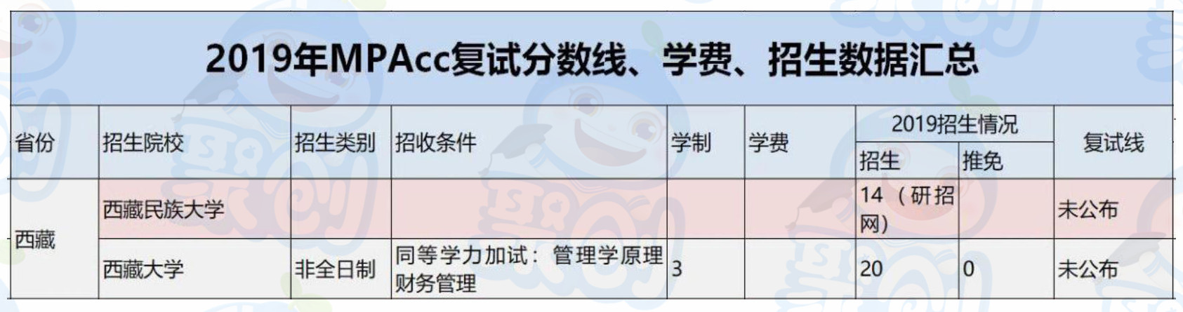 以上是聚创考研网为考生整理的"【西藏】2019年高校会计硕士考研分数线、学费、招生情况分析"的相关考研信息,希望对大家考研备考有所帮助! 备考过程中如有疑问,也可以添加老师微信juchuang911进行咨询。