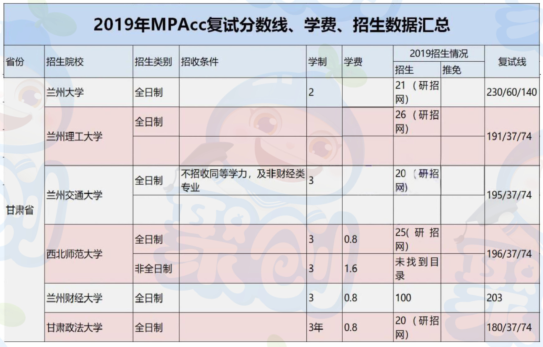 以上是聚创考研网为考生整理的"【甘肃省】2019年高校会计硕士考研分数线、学费、招生情况分析"的相关考研信息,希望对大家考研备考有所帮助! 备考过程中如有疑问,也可以添加老师微信juchuang911进行咨询。