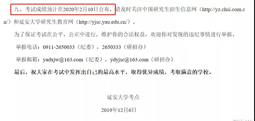 延安大学学科建设与研究生教育网:考试成绩预计在2020年2月10日公布,请及时关注中国研究生招生信息网(http://yz.chsi.com.cn/)和延安大学研究生教育网(http://yjsc.yau.edu.cn/)