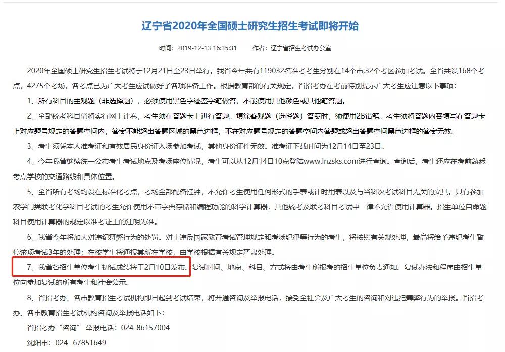 辽宁省招生考试办公室:我省各招生单位考生初试成绩将于2月10日发布。复试时间、地点、科目、方式将由考生所报考招生单位负责通知。