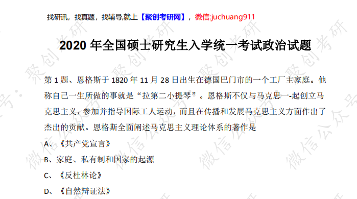 以上是聚创考研网为考生整理的"【聚创考研】2020年考研政治试题、答案解析"的相关考研信息,希望对大家考研备考有所帮助! 备考过程中如有疑问,也可以添加老师微信juchuang911进行咨询。