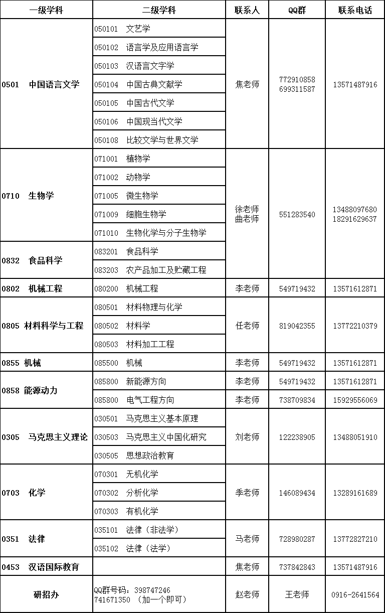 各学科领域(方向)联系人及联系方式