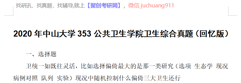 以上是聚创考研网为考生整理的"2020年中山大学353公共卫生学院卫生综合考研专业课真题(回忆版)"的相关考研信息,希望对大家考研备考有所帮助! 备考过程中如有疑问,也可以添加老师微信juchuang911进行咨询。