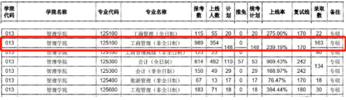 由图表可知,暨南大学管理学院125100工商管理(非全日制)2019年报考人数989人,上线人数354人,和EMBA非全统考共计划招生148人,复试线为170分,最终录取163人。
