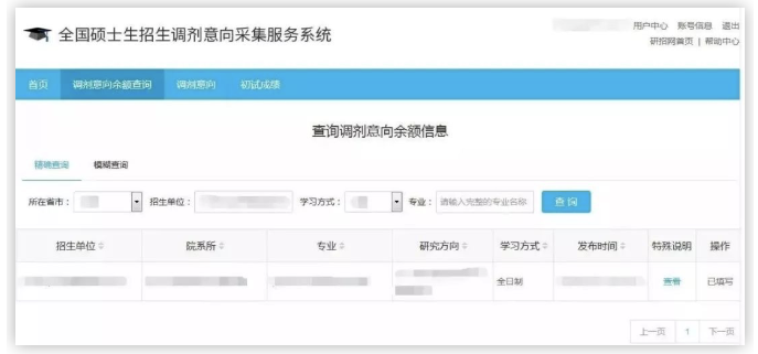 4、调剂服务系统开通后,调剂意向采集服务系统的查询调剂意向余额信息和填写调剂意向功能将关闭。考生可以在调剂服务系统查询余额信息。