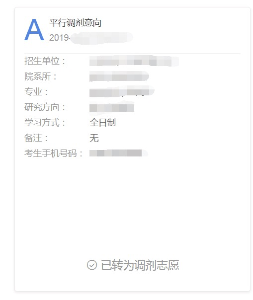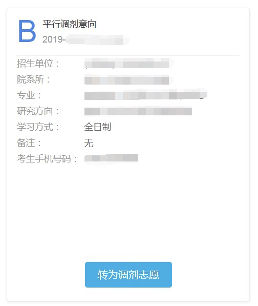 转为调剂志愿后,页面下方会显示“已转为调剂志愿”,招生单位可以在调剂服务系统后台查询到相应的志愿信息。转为调剂志愿后,左上角会显示“已能被招生单位查询”,招生单位可以在调剂服务系统后台查询到相应的志愿信息。