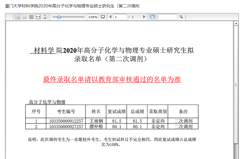 据悉,厦门大学材料学院2020年高分子化学与物理专业硕士研究生(第二次调剂)拟录取名单已公布,聚创考研网小编为大家整理相关内容,具体如下:
