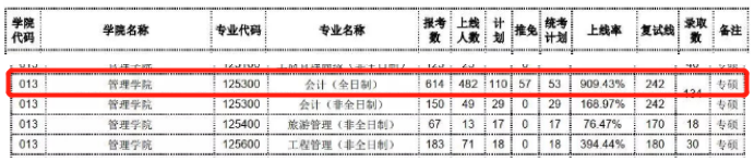 会计专硕(非全日制)2019年报考人数150人,上线人数49人,计划招生29人,统考计划招生29人,复试线242;