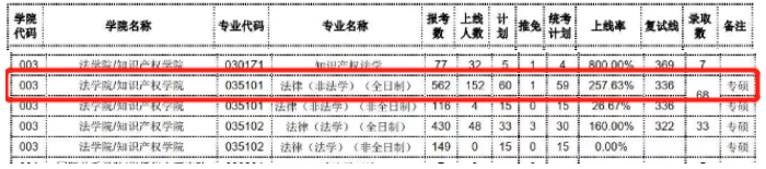 由图表可知,暨南大学法学院/知识产权研究院035101法律(非法学)(全日制)2019年报考人数562人,上线人数152人,计划招生60人,推免1人,统考计划招生59人,复试线336,和法律(非法学)(非全日制)共录取68人;