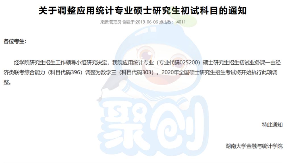 应用统计专业(专业代码025200)硕士研究生招生初试业务课一由经济类联考综合能力(科目代码396)调整为数学三(科目代码303)。