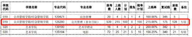 由图表可知,暨南大学公共管理学院/应急管理学院125200公共管理硕士(非全日制)2019年报考人数539人,上线人数215人,推免0人,统考计划招生100人,复试线175,共录取128人;