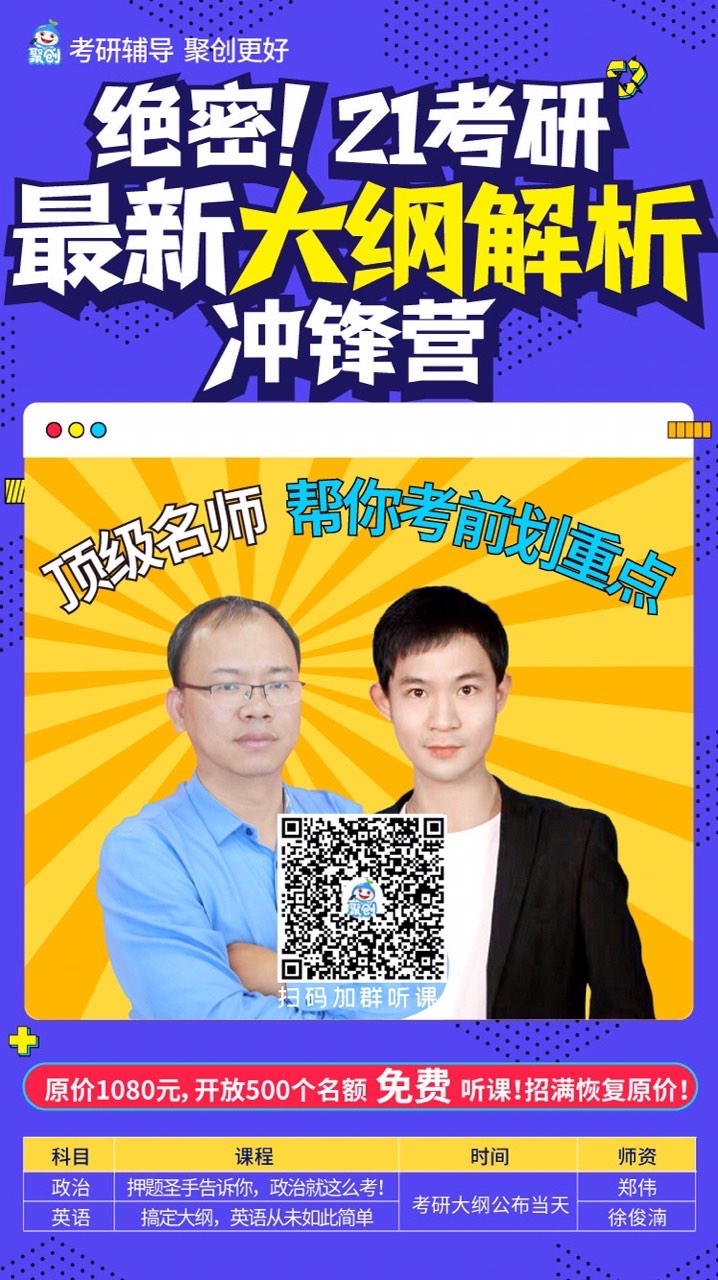 考研大纲公布当天我们聚创考研老师会开2021考研大纲解析讲座!帮你考前划重点!请加海报里二维码加群抢座!