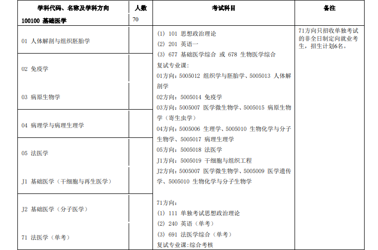 ②100100基础医学:增加71法医学(单考),考试科目考71方向