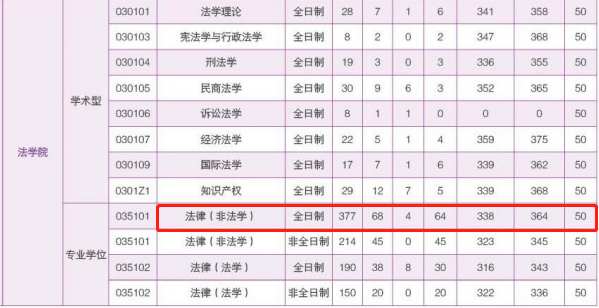 ①华南理工大学法学院法律(非法学)全日制2019年报考人数377人,录取总数68人,推免人数4人,统考录取人数64人,录取分数最低分338分,初试录取平均分364分。