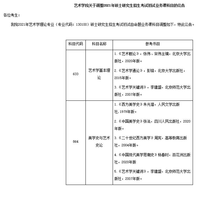 艺术学院调整2021年硕士研究生招生考试初试业务课科目:2021年艺术学理论专业(专业代码:130100)硕士研究生招生考试初试自命题业务课科目调整如下: