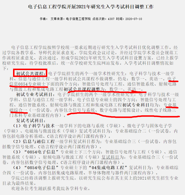 根据学校的要求,电子信息工程学院2021年研究生入学考试科目调整,电子科学与技术一级学科、信息与通信工程一级学科初试公共课程不做调整,仍是:数学一、英语一。