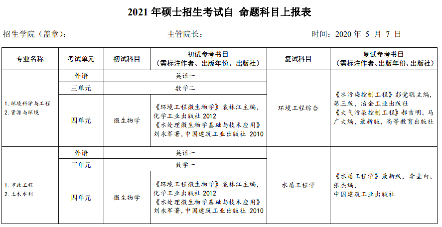 环境与市政工程学院2021年硕士招生考试自命题科目
