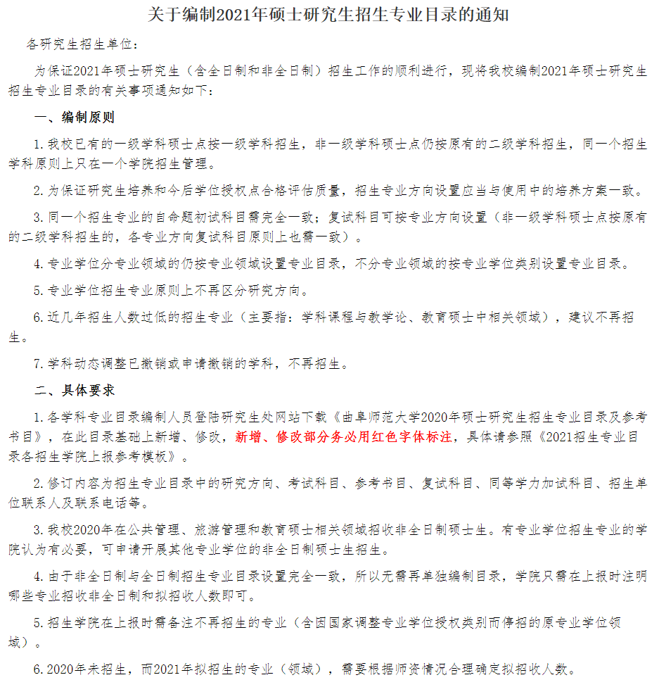 关于编制2021年硕士研究生招生专业目录的通知,近几年招生人数过低的专业(主要指:学科课程与教学论、教育硕士中相关领域)建议不再招生。学科动态调整已撤销或申请撤销的学科,不再招生。