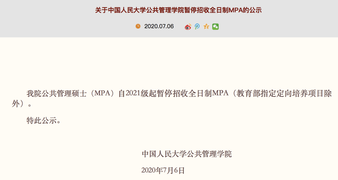中国人民大学公共管理学院发布公告,自2021年起将暂停招收全日制MPA(公共管理硕士)。