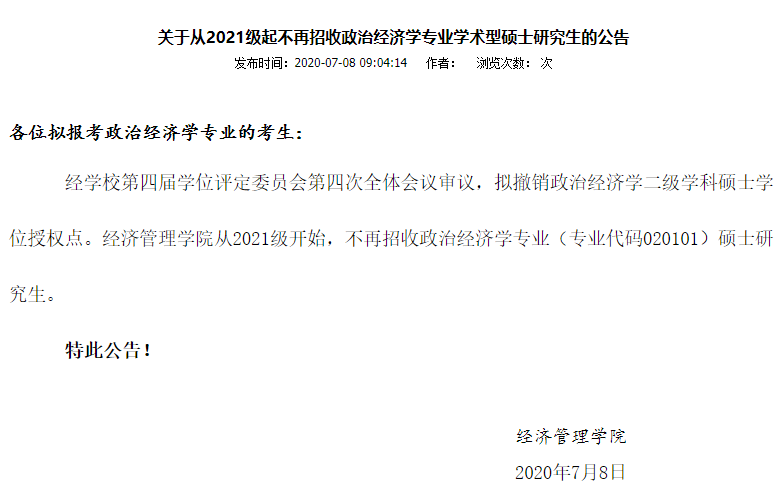 西南大学经济管理学院公告,从2021级开始,不再招收政治经济学专业(专业代码020101)硕士研究生。