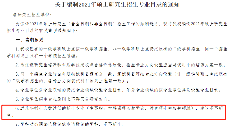 曲阜师范大学发布的《关于编制2021年硕士研究生招生专业目录的通知》中,明确两类专业将不再招生:一类是近几年招生人数过低的专业如学科课程与教学论、教育硕士中相关领域,另一类是学科动态调整已撤销或申请撤销的学科。