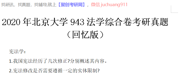 以上是聚创考研网为考生整理的"2020年北京大学943法学综合卷考研真题(回忆版)"的相关考研信息,希望对大家考研备考有所帮助! 备考过程中如有疑问,也可以添加老师微信juchuang911进行咨询。