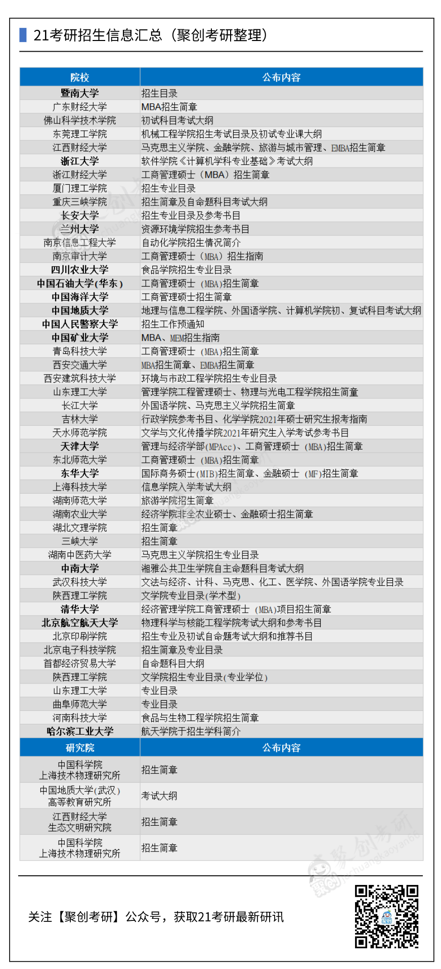 目前,全国各地已经有许多所高校公布了2021年研究生招生的考试大纲、参考书目等,对于考生来说这些信息都至关重要。聚创考研网小编整理了部分院校已经公布的信息,希望能帮助到大家~