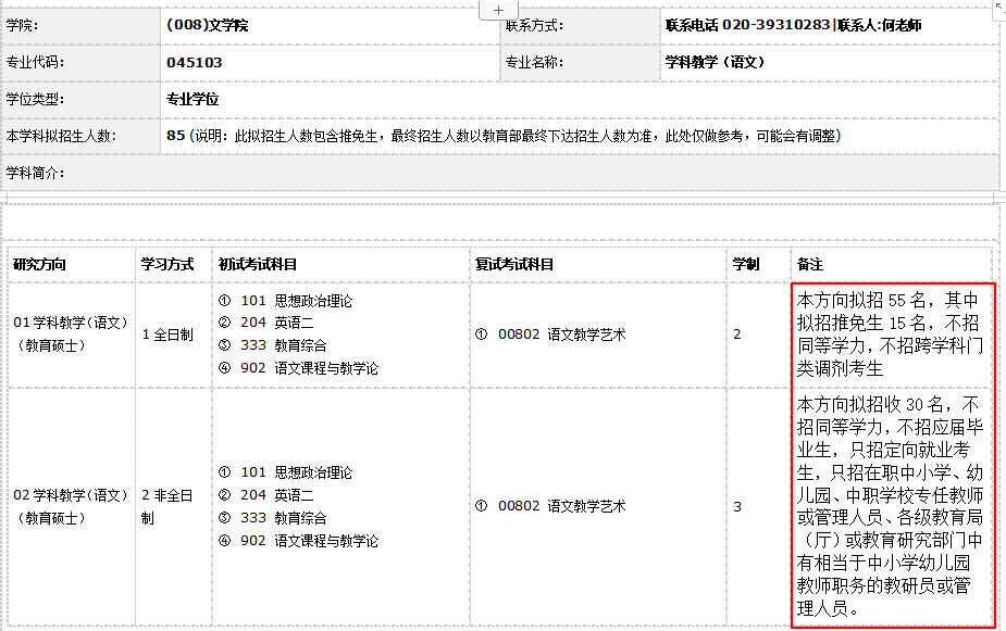 注:华南师大学科教学(语文)全日制不招收同等学力考生,不招跨学科门类调剂考生;非全日制不招同等学力,不招应届毕业生,只招定向就业考生,只招在职中小学、幼儿园、中职学校专任教师或管理人员、各级教育局(厅)或教育研究部门中有相当于中小学幼儿园教师职务的教研员或管理人员。