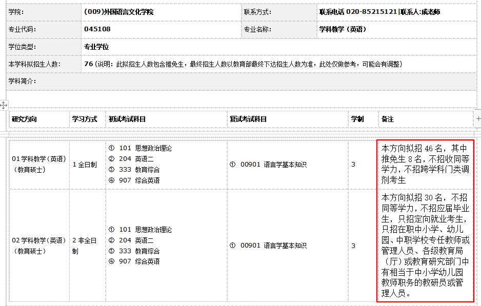 ①学科教学(英语)全日制不招收同等学力,也就是说大专毕业满两年也不能报考华南师大的学科教学(英语)专业;不招收跨学科门类调剂考生,如果有意向调剂到华南师大学科教学(英语)的考生,必须是报考教育类硕士的考生。