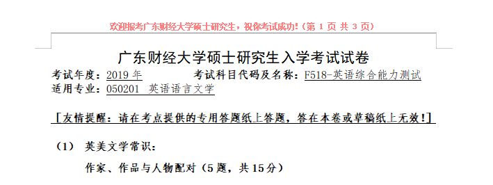 考研学习中,专业课占的分值较大。报考院校专业的考研专业课真题是专业课复习中必不可少的资料。聚创广东财经大学考研小编为大家整理了2019年广东财经大学F518英语综合能力测试考研真题(复试),并且可以提供广东财经大学考研专业课辅导,希望更多考生能够在专业课上赢得高分,升入理想的院校。