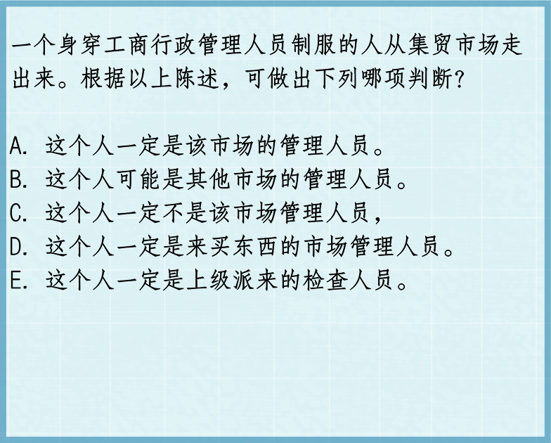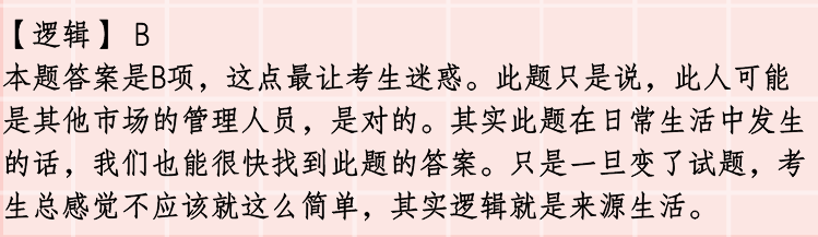 以上是聚创考研网为考生整理的"2021年管理类考研:逻辑部分-工商行政管理人员出入集贸市场陈述判断Part.123"的相关考研信息,希望对大家考研备考有所帮助! 备考过程中如有疑问,也可以添加老师微信juchuang911进行咨询。