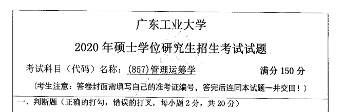 考研学习中,专业课占的分值较大。报考院校专业的考研专业课真题是专业课复习中必不可少的资料。聚创广东工业大学考研小编为大家整理了2020年广东工业大学857管理运筹学考研真题(完整版),并且可以提供广东工业大学考研专业课辅导,希望更多考生能够在专业课上赢得高分,升入理想的院校。