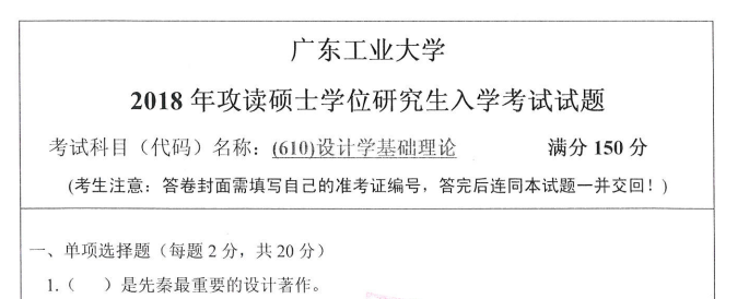 考研学习中,专业课占的分值较大。报考院校专业的考研专业课真题是专业课复习中必不可少的资料。聚创广东工业大学考研小编为大家整理了2018年广东工业大学610设计学基础理论(一)考研真题(完整版),并且可以提供广东工业大学考研专业课辅导,希望更多考生能够在专业课上赢得高分,升入理想的院校。