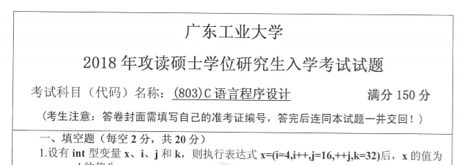 完整版请下载附件:2018年广东工业大学803C语言程序设计考研真题(完整版)