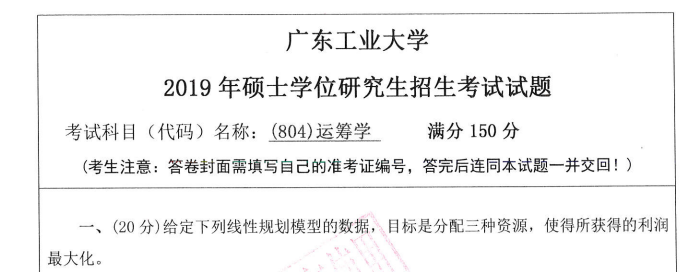 考研学习中,专业课占的分值较大。报考院校专业的考研专业课真题是专业课复习中必不可少的资料。聚创广东工业大学考研赖老师为大家整理了2019年广东工业大学804运筹学考研真题(完整版),并且可以提供广东工业大学考研专业课辅导,希望更多考生能够在专业课上赢得高分,升入理想的院校。