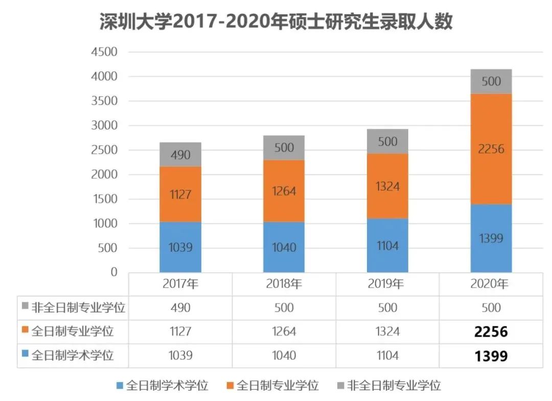 深圳大学位于经济特区深圳市,是深圳一所综合性大学,也是近几年考研热门高校。同比2019年,2020年在推免生接收人数突破600的基础上,报考人数高达22715人,增幅为41.8%;过国家线人数达5994人,增幅27.2%。从录取人数来看,2017年~2019年深圳大学的录取总数很稳定,只有2020年有较大幅度的扩招。