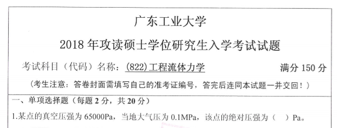 考研学习中,专业课占的分值较大。报考院校专业的考研专业课真题是专业课复习中必不可少的资料。聚创广东工业大学考研小编为大家整理了2018年广东工业大学822工程流体力学考研真题(完整版),并且可以提供广东工业大学考研专业课辅导,希望更多考生能够在专业课上赢得高分,升入理想的院校。