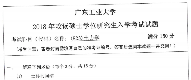 考研学习中,专业课占的分值较大。报考院校专业的考研专业课真题是专业课复习中必不可少的资料。聚创广东工业大学考研小编为大家整理了2018年广东工业大学823土力学考研真题(完整版),并且可以提供广东工业大学考研专业课辅导,希望更多考生能够在专业课上赢得高分,升入理想的院校。
