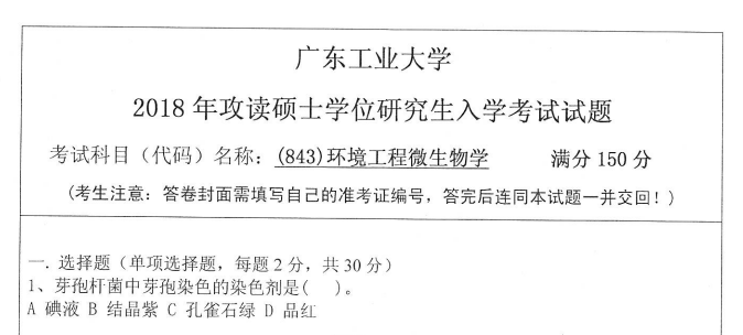 考研学习中,专业课占的分值较大。报考院校专业的考研专业课真题是专业课复习中必不可少的资料。聚创广东工业大学考研小编为大家整理了2018年广东工业大学843环境工程微生物学考研真题(完整版),并且可以提供广东工业大学考研专业课辅导,希望更多考生能够在专业课上赢得高分,升入理想的院校。
