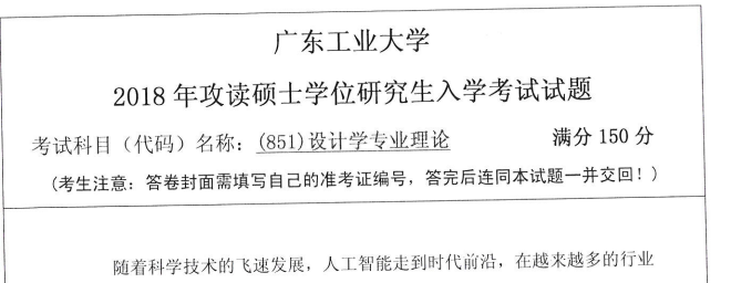 考研学习中,专业课占的分值较大。报考院校专业的考研专业课真题是专业课复习中必不可少的资料。聚创广东工业大学考研小编为大家整理了2018年广东工业大学851设计学专业理论考研真题(完整版),并且可以提供广东工业大学考研专业课辅导,希望更多考生能够在专业课上赢得高分,升入理想的院校。
